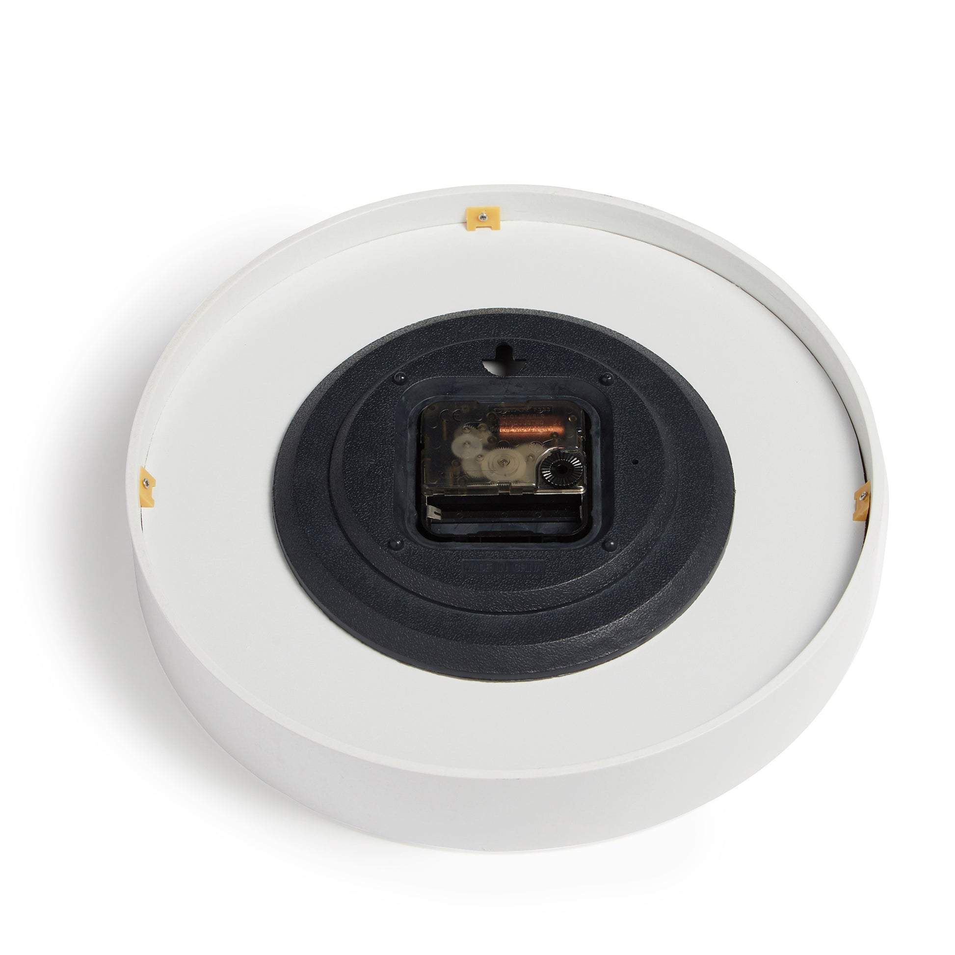 Design is printed onto an aluminium face to ensure a bright, long-lasting print. White painted bamboo round frame, finished with a Plexiglas lens for crystal-clear transparency and added break resistance. Ready to hang, thanks to a built-in rear hook.